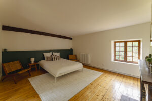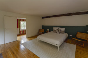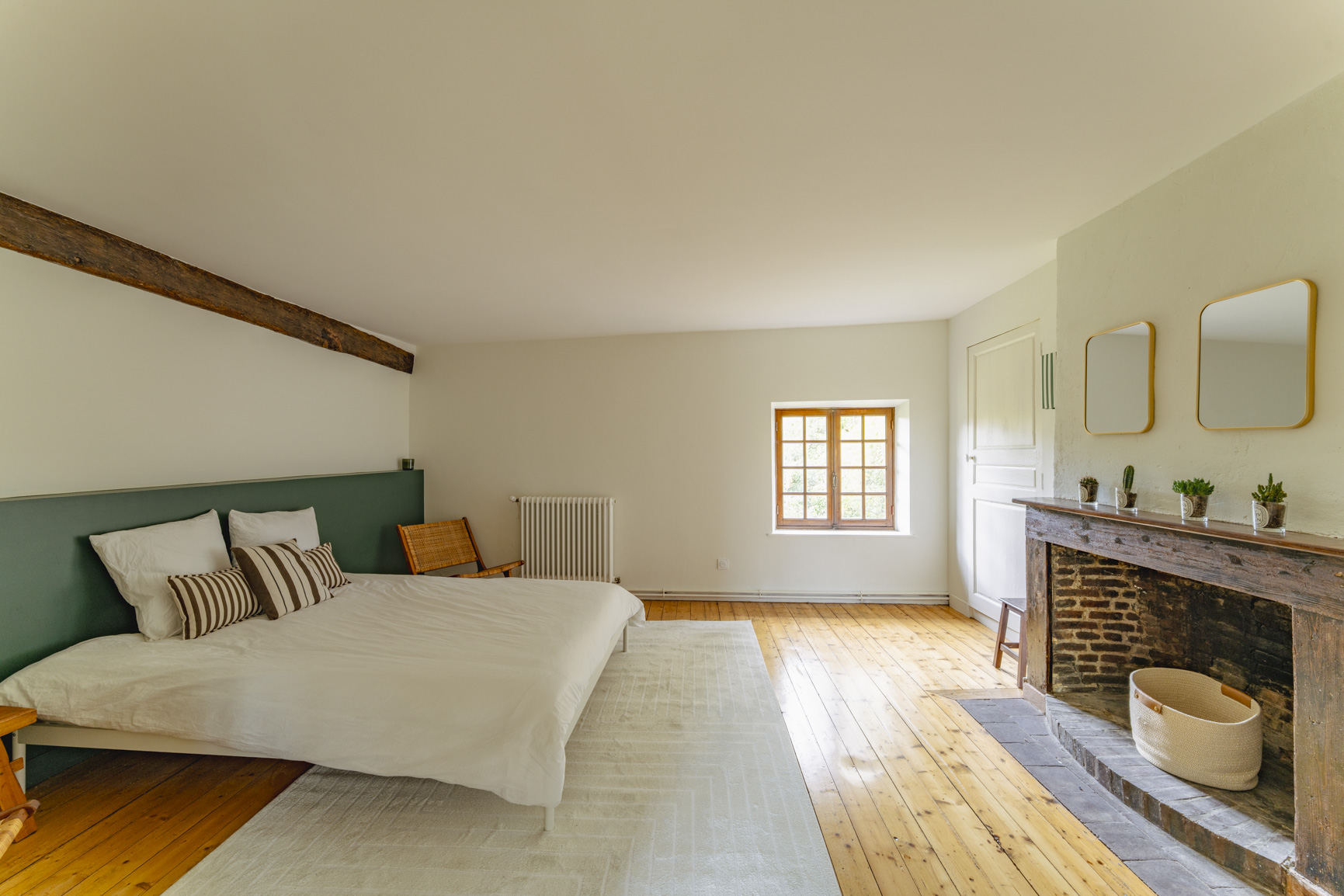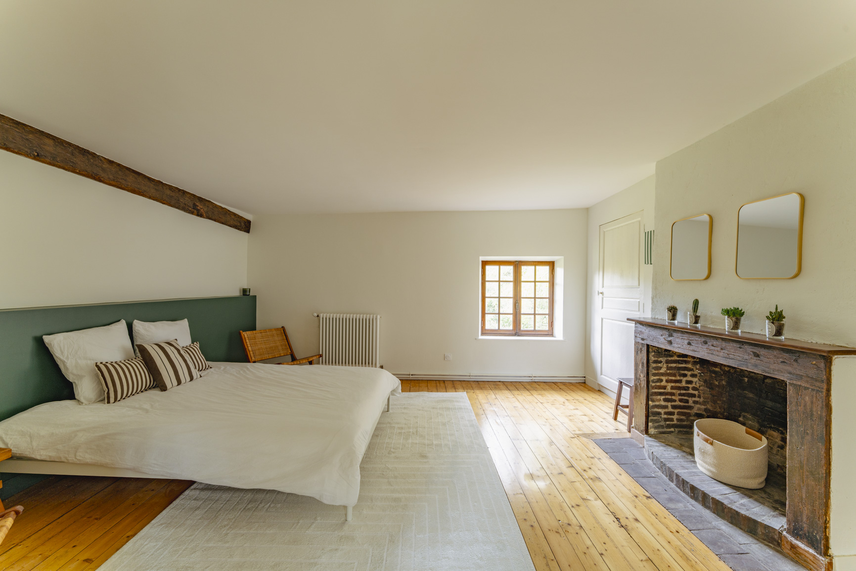 Une chambre avec cheminée, dressing et une chambre d’enfant communicante avec son lit bébé.