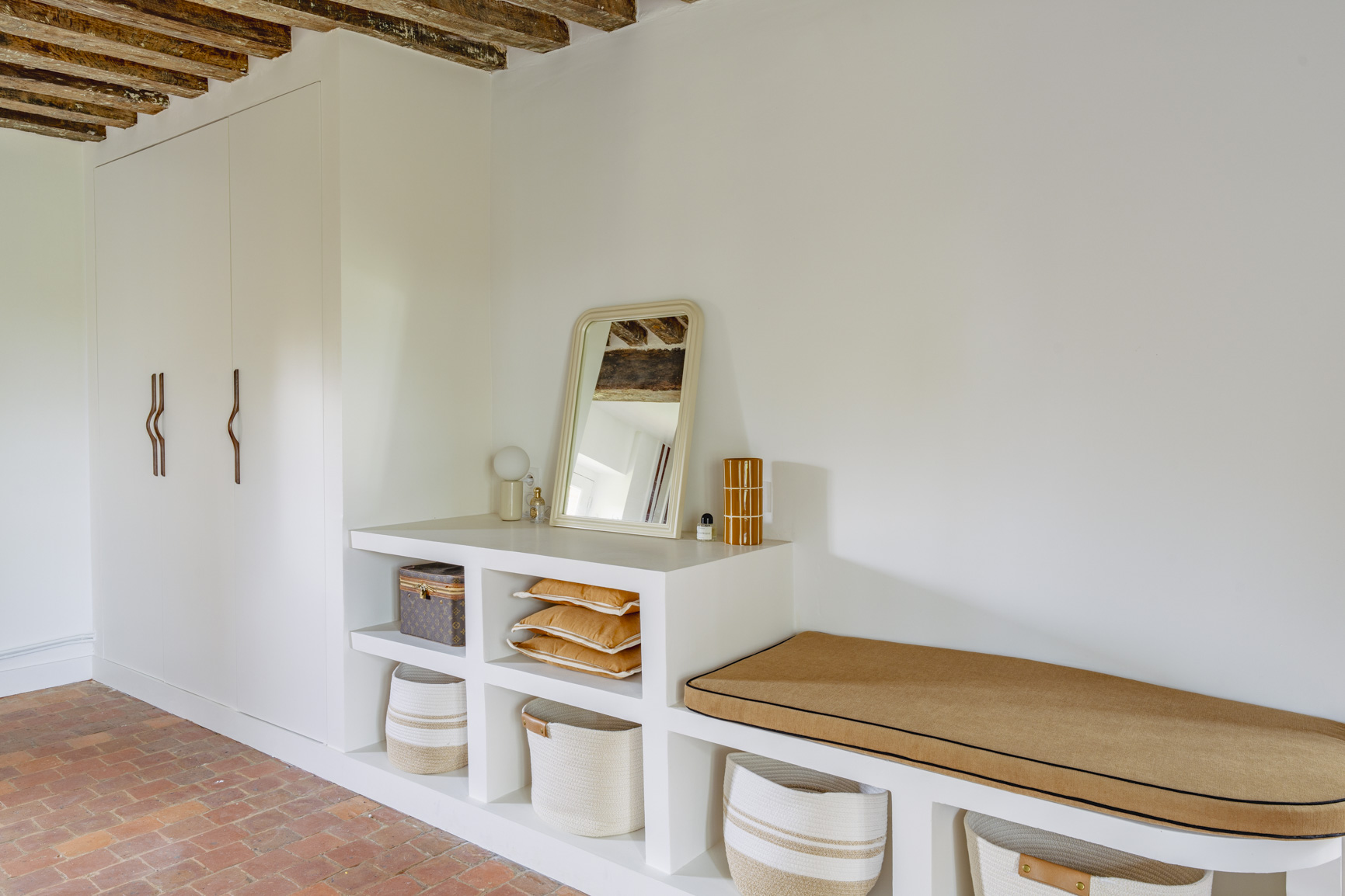 La salle TV est un cocon de confort. Canapé généreux, poutres blanches et lumière douce : tout y invite à la détente. On y regarde un film, on y lit, on s’y retrouve en fin de journée.