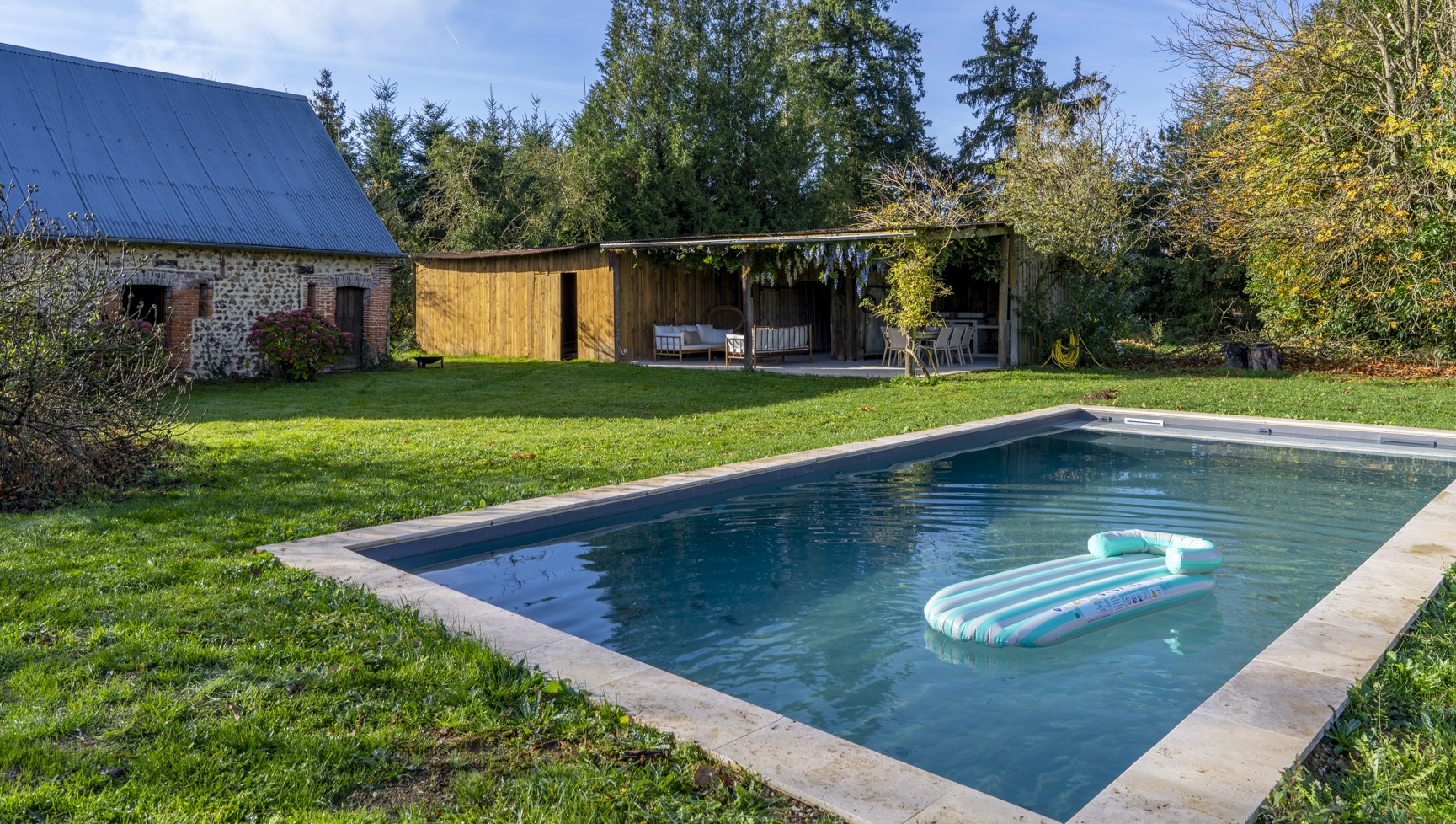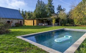 La piscine sécurisée et chauffée d’avril à septembre devient le cœur des journées d’été. Un lieu de détente et de partage, à l’abri des regards, au milieu de la verdure.